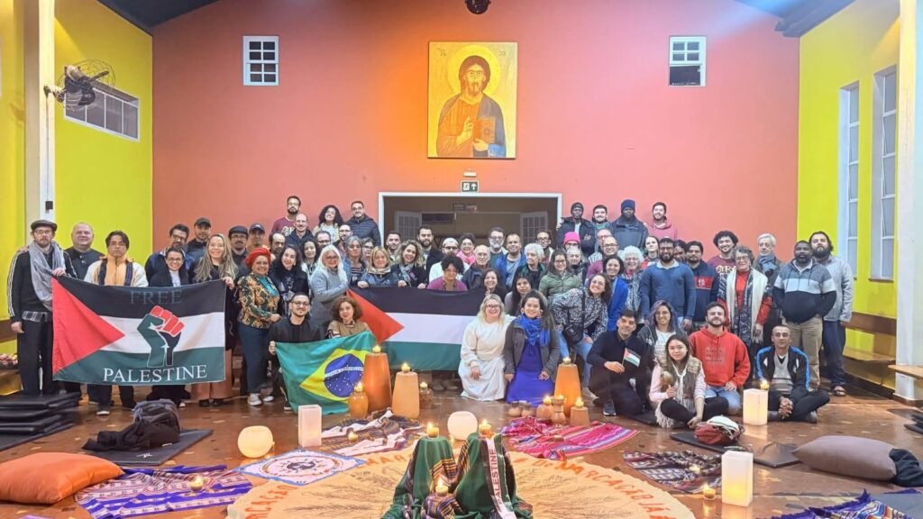The vigil created a sacred space for prayer, meditation, song, light, and presence. It was a moment where traditions met — not to dilute their particularities, but to strengthen a shared cry for life. Participants prayed, chanted, and meditated together, holding in their hearts the suffering of the Palestinian people and the dream of a world without violence. Among the participating organizations and communities were: CESEEP (Ecumenical Center for Service to Evangelization and Popular Education); SEFRAS (Franciscan Solidarity Service); Center Magis Anchietanum (Jesuit Youth Center); Koinonia – Ecumenical Presence and Service; Therigatha Urban Zen Monastery; The Hare Krishna Movement; Muslim and Jewish representatives; Practitioners of Afro-Brazilian religions (such as Candomblé and Umbanda); Indigenous spiritual leaders and community members.